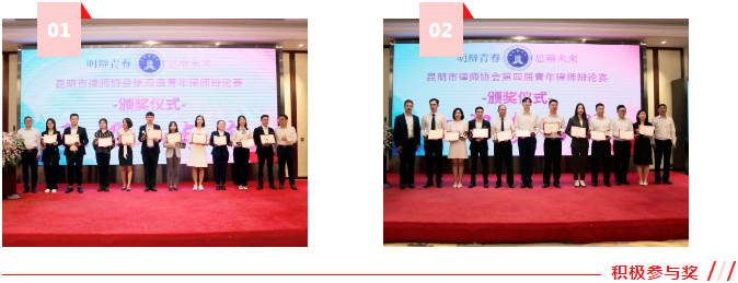 最终,云南微行律师事务所“微名远扬队”一举拿下本届青年律师辩论赛的冠军,北京大成(昆明)律师事务所的“大象无形队”和“大音希声队”分别获得亚军与季军。现场嘉宾分别为“优秀辩手”“积极参与奖”“优秀宣传奖”“优秀组织奖”“特殊贡献奖”“最佳辩手”“金句王”,以及冠军、亚军、季军的获奖得主进行颁奖。