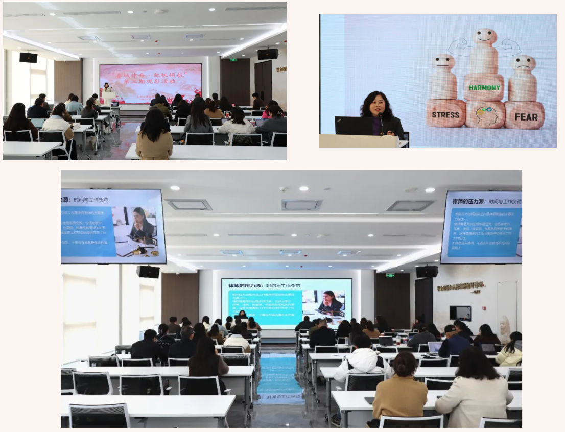 观影前,特邀嘉宾国家二级心理咨询师、中国心理学会注册会员刘涛以《理性与情感之间:律师的高效能压力管理与情绪调节》为题,用生动的案例为律师的高效能压力管理与情绪调节进行现场教学。随后为到场律师提供了“一对一”的心理咨询服务。